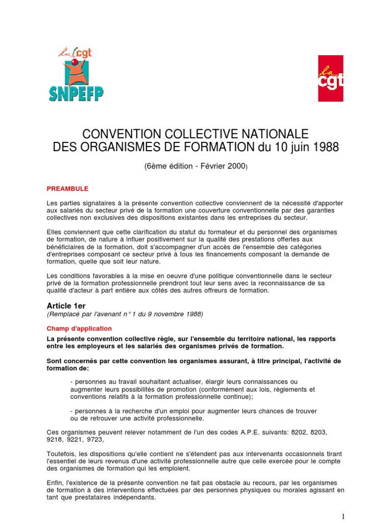 1 sont exclus de lextension les organismes de formation relevant des professions agricoles telles que définies à larticle 1144 du code rural et dans des conditions identiques à celles précisées à larticle 1er de la convention susvisée en ce qui concerne les asfo les organismes de formation créés par des organisations professionnelles demployeurs du secteur des métiers membres. La présente convention collective nationale des organismes de formation règle sur lensemble du territoire national les rapports entre les employeurs et les salariés des organismes privés de formation. Organismes de formation brochure n 3249. Familles professionnelles et filières de métiers. Télécharger rtf avenant du 1er décembre 2017 portant modification des articles 181 et 182 de la convention collective. La version à jour 2020 de la convention collective des organismes de formation peut être gratuitement téléchargé en ligne via le lien ci dessus sous la forme dun fichier pdf.