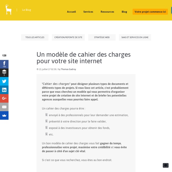 Un cahier des charges est un document contractuel décrivant ce qui est attendu du maître doeuvre par le maître douvrage. à savoir faire létat des besoins de votre projet web tout en donnant un maximum de spécifications techniques. Les principaux éléments à intégrer dans le cahier des charges. Nous vous proposons ici un exemple de cahier des charges simple pour des demandes restant professionnelles mais ne requérant pas de sortir la grande artillerie.