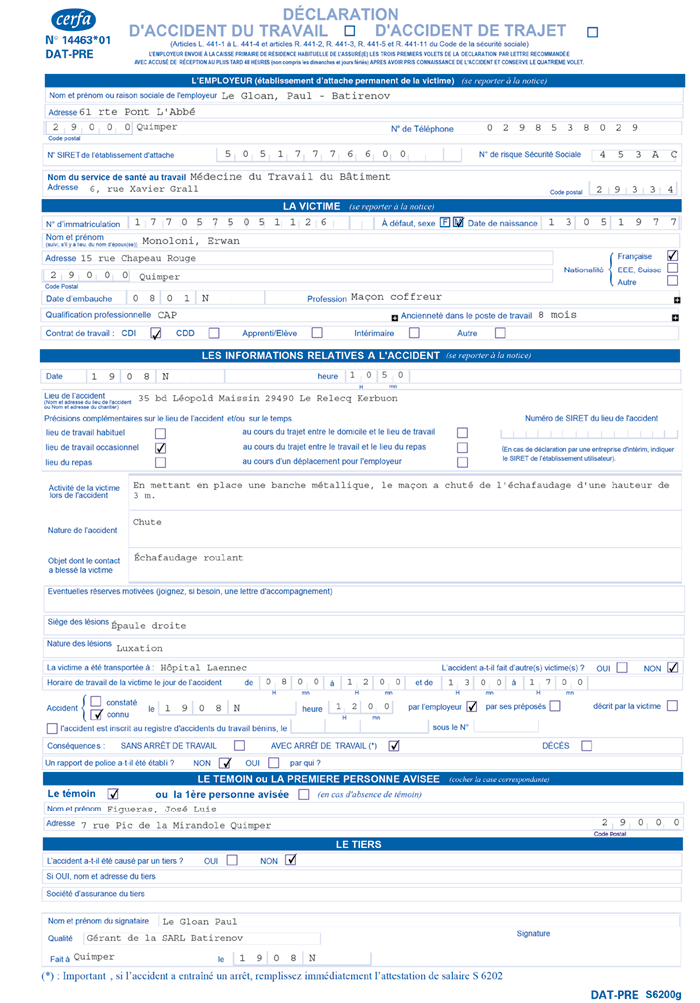 Formulaire accident de travail. Annexe formulaire pour le travail dans un endroit isolé. Ce formulaire téléchargeable peut comporter des obstacles à laccessibilité. Si la cause de laccident est inconnue et que lassociation dassurance accident aaa refuse dindemniser laccident laaa devra prouver que le dommage a une origine totalement étrangère au travail. Déclaration daccident du travail ou de trajet cerfa n 1446303 ex 60 3682 caisse nationale dassurance maladie cnam autre numéro. Feuille daccident du travail ou de maladie professionnelle lorsquun accident a eu lieu la feuille daccident du travail ou de maladie professionnelle est remise à la victime par lemployeur qui établit parallèlement la déclaration daccident du travail réf. Si vous éprouvez de la difficulté à remplir ce formulaire veuillez communiquer avec nous au 1 844 838 0808.