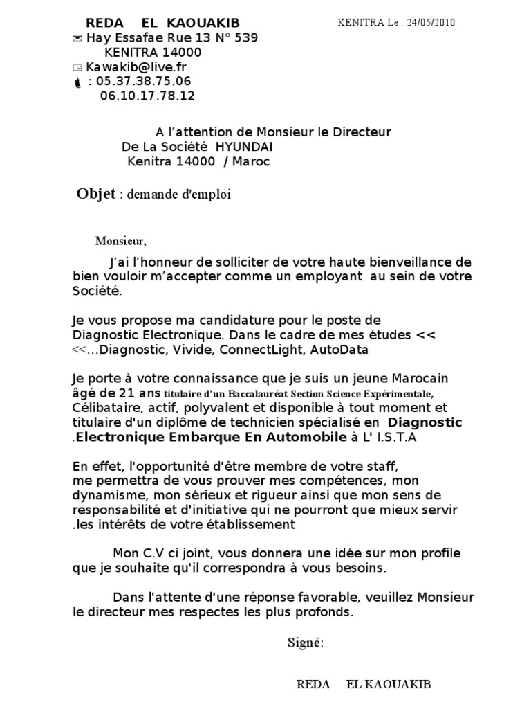 Je prends linitiative de vous signaler. En effet je suis titulaire dun brevet de technicien supérieur en réseau informatique et télécommunication.