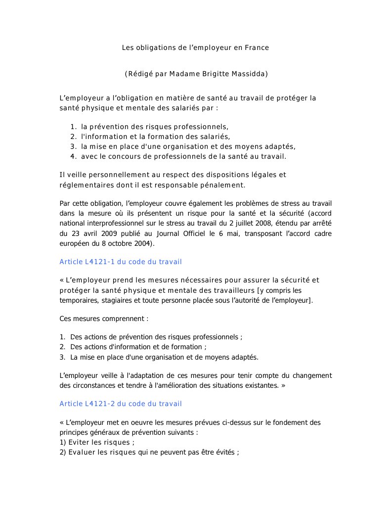 01102017 lemployeur prend les mesures nécessaires pour assurer la sécurité et protéger la santé physique et mentale des travailleurs. Retrouvez lintégralité du code du travail ci dessous. Code du travail dernière modification. Code du travail mis à jour le. Lemployeur ne doit pas seulement diminuer le risque mais lempêcher. Les cookies nous permettent de personnaliser les annonces.