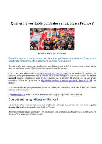 Les syndicats en france. Allez découvrir les exercices ci dessous. En france le taux de syndicalisation est inférieur à 10 daprès le ministère du travail. Les syndicats ont comme objectif la défense des conditions demploi des travailleurs ou la défense des intérêts des patrons. Elles sattachent à défendre les intérêts des adhérents de leur branche professionnelle ou branche dactivité respective. Alors que ces derniers mobilisent face à la réforme annoncée de la sncf y a t il péril en la demeure. L a création de syndicats de salariés en france est codifiée par les articles l.