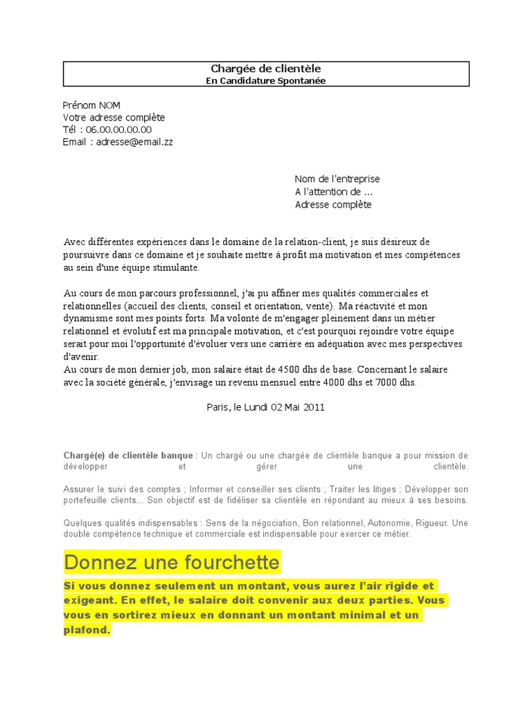 Prénom nom 18 avenue du général de gaulle 00 000 ville france 0500000000 à lintention du directeur commercial entreprise z monsieur. Lettre de motivation pour un emploi de chargé de clientèle. Lettre de motivation chargé de clientèle. Voici un exemple de lettre de motivation à télécharger gratuitement au format word. Ma notamment permis de créer une vraie relation de confiance avec la clientèle dont javais la charge. Au cours de mes précédentes expériences professionnelles jai eu lopportunité de développer mon sens du contact et mon goût pour le challenge.