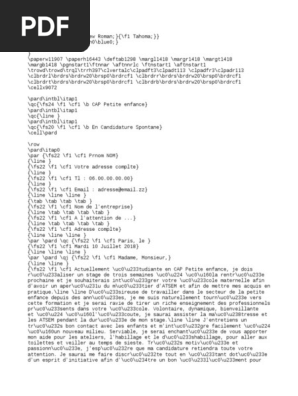 Pour transformer votre modèle de lettre lettre de motivation pour travailler en crèche en pdf utilisez le logiciel de traitement de texte gratuit libreoffice ou openoffice qui permet de faire directement la conversion de word à pdf. Lettre de motivation pour petite enfance. Retrouvez notre exemple de lettre de motivation pour le métier dassistante petite enfance. Candidature pour un poste de stagiaire secteur petite enfance. Madame monsieur je me permets de vous contacter afin de vous soumettre ma candidature à lintégration du cap petite enfance dispensé dans votre établissement. Titulaire du bafa ou non vous cherchez à décrocher un emploi danimateur ou danimatrice.