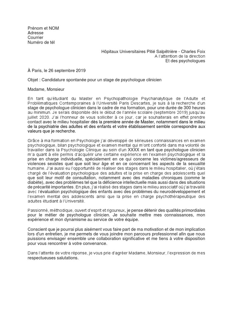 Modèle de lettre de motivation gratuit pour un poste de psychologue clinicienne en candidature spontanée niveau débutant. Nom prénom adresse téléphone email. La lettre de motivation du psychologue doit contenir certaines qualités qui apporteront du poids à votre candidature. Lettre de motivation de psychologue afin de rédiger la lettre de motivation qui fera mouche vous devez analyser votre parcours professionnel et personnel afin den extraire ce qui fera la différence avec les autres candidatures. Le goût du contact le sens de lobservation et danalyse ou encore lempathie. Candidature spontanée pour un poste de psychologue.