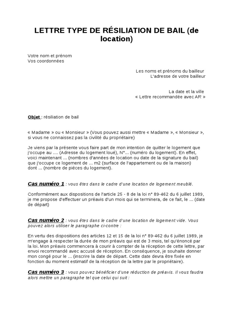 Conformément à larticle 12 de la loi du 6 juillet 1989 je respecterai un délai de préavis de 3 mois à compter de la réception de ce courrier. Préavis de 1 mois. Le contenu de ce courrier nest pas réglementé mais il convient dans la pratique de respecter certaines règles. Lettre recommandée avec accusé de réception objet. Rédige une lettre claire et concise contenant la date de ton départ et ladresse de ton logement envoie ta lettre de préavis en recommandé avec accusé de réception la date de. Conformément aux articles 12 et 15 de la loi du 6 juillet 1989 je respecterai un délai de préavis de 3 mois à compter de la réception de ce courrier.