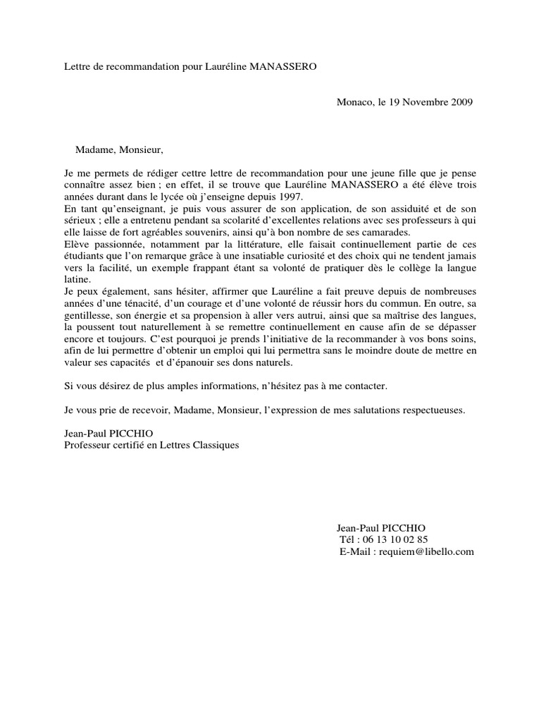 Exemple de lettre de recommandation pour un étudiant. A votre ville date. Lettre de recommandation dun professeur pour un étudiant. Madame monsieur en tant que professeur de intitulé de la matière enseignée à. Lieu date objet. Nom prénom adresse téléphone email.