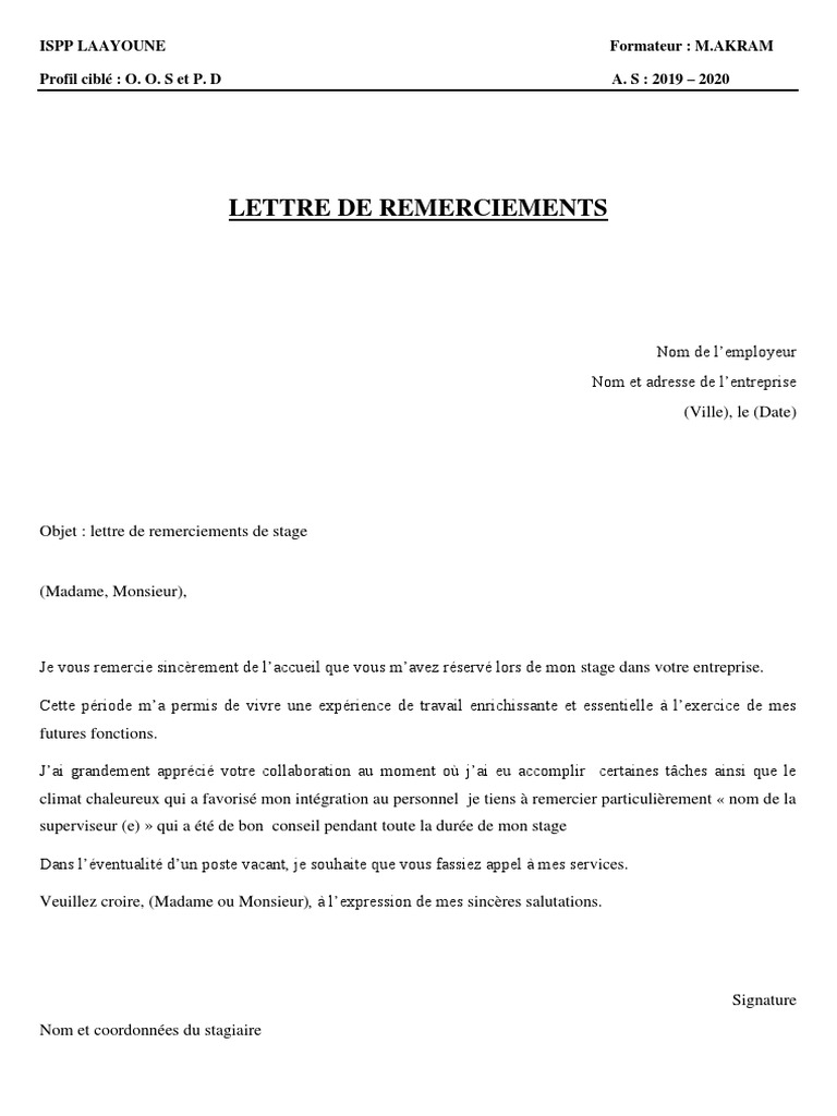 Téléchargez gratuitement ce modèle de lettre. Il nest bien sûr pas obligatoire de remercier votre maitre de stage après avoir quitté votre entreprise.