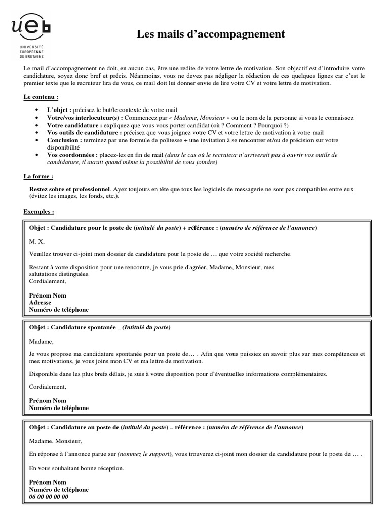 Lobjet du mail est en quelque sorte le titre de votre candidature. Exemple gratuit demail et de lettre de candidature spontanée. Le mail de motivation. Candidature pour le poste de responsable comptable monsieur vous trouverez ci joint mon dossier de candidature cv et lettre de motivation pour le poste de responsable comptable que vous proposez sur le site cadremploi. Son objectif est dintroduire votre candidature soyez donc bref et précis.