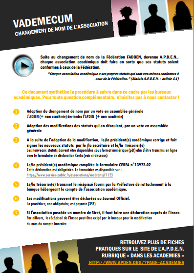 Vous pouvez déclarer en ligne sur service public les modifications de léquipe des administrateurs du titre de lobjet du siège social des statuts de la liste des établissements de la situation patrimoniale de la composition dune union ou dune fédération des coordonnées de gestion de votre association ou sa dissolution. Le siège social le nom les dirigeants ou lobjet social dune association peuvent être modifiés en ligne à tout moment.