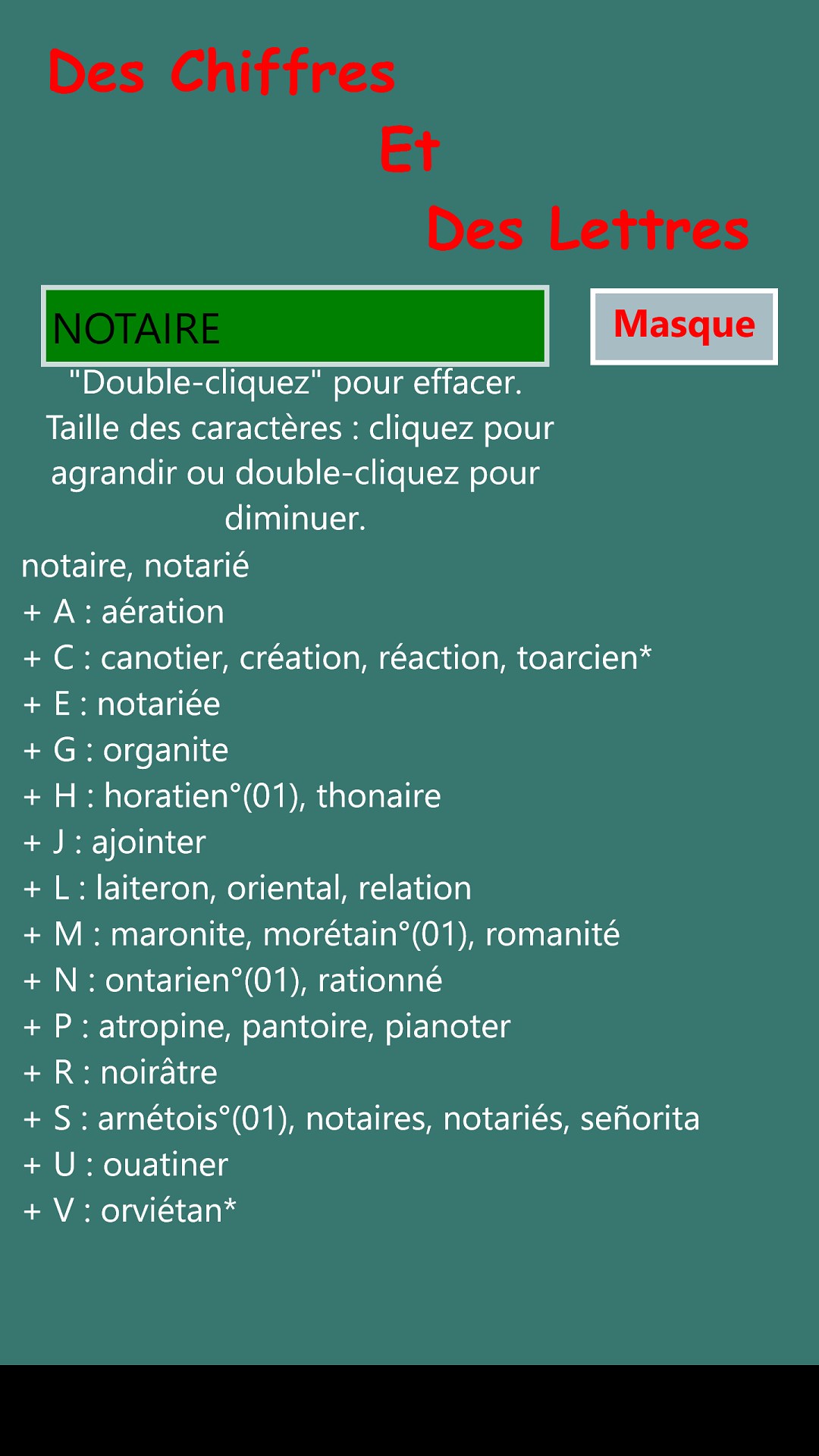 La version officielle du jeu interdit dutiliser plusieurs fois une même lettre du tirage et autorise à mélanger lordre des lettres pour trouver des mots mais il existe des variantes de ce jeu avec les 2 options suivantes. La recherche des mots possibles avec le tirage aadeilmnsv affichera la liste suivante. Listes de mots contenant une ou plusieurs lettres.